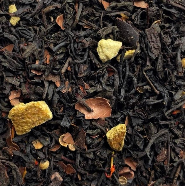 Black tea with raw cocoa, chocolate and orange.