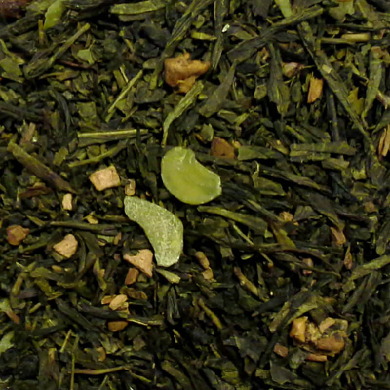 Green Chinese Sencha with cinnamon, almond slivers, apricot kernels and real vanilla.