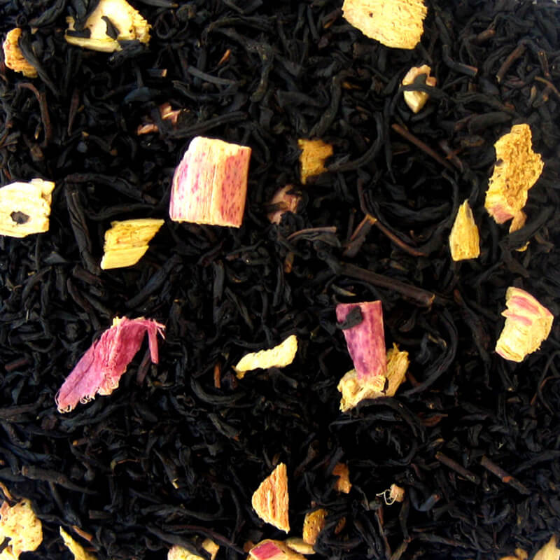 Aromatized black tea from Ceylon and China with pieces of rhubarb. The tea has a wonderful creamy and fresh taste of rhubarb.