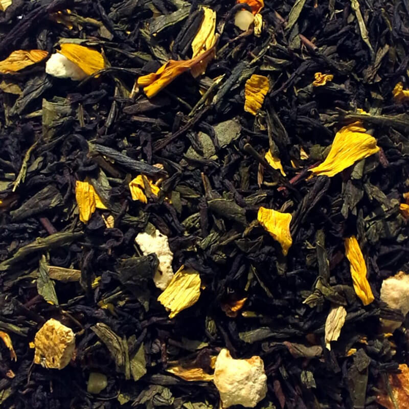 Black and green tea with orange peel, peach and almond pieces.