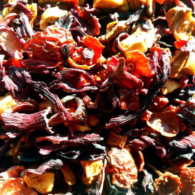 Creamy fruit tea with apple pieces, rosehip peel, hibiscus leaves and vanilla.
