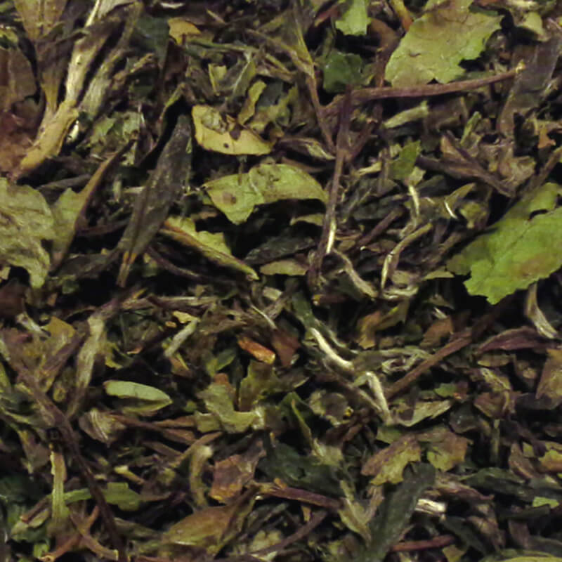 Meget varieret udseende med alle nuancer af grøn samt en god mængde lange, sølv-hvide bladnåle. Klart ravfarvet i koppen med elegant krydret smag med nøddeagtige noter.