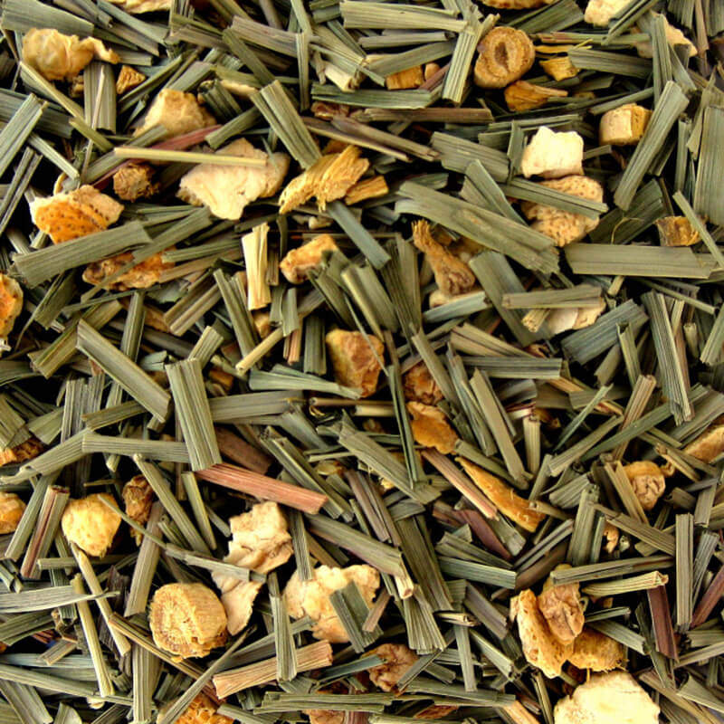 Ingefær, citrongræs, pebermynte, citronskal, lakridsrod og sorte peberkorn.