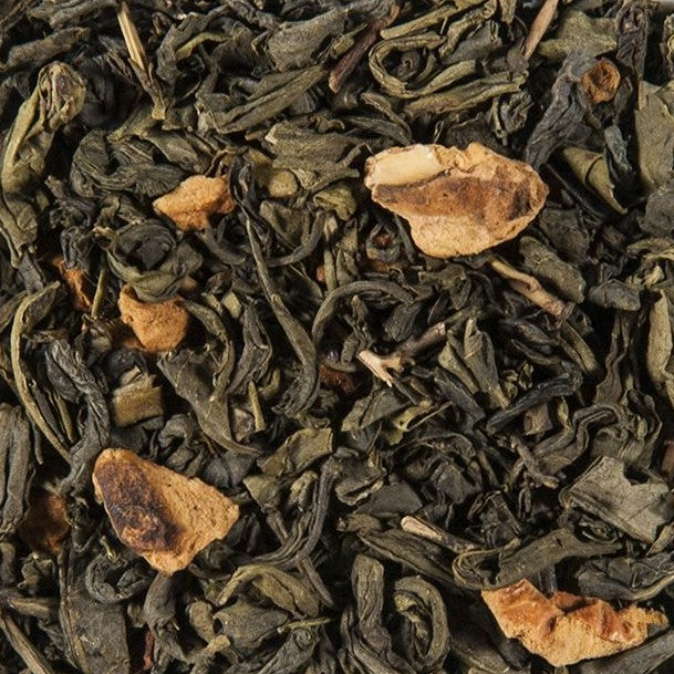 Grøn kinesisk the 'China Chun Me' med æblestykker.