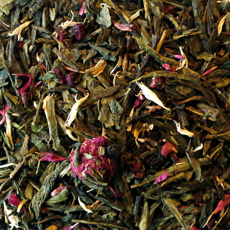 Grøn kinesisk the med hele hindbær, samt pink og hvid kornblomst.
