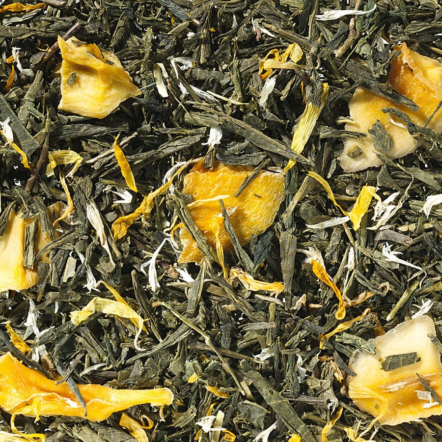 Grøn the med mangostykker, hvid kornblomst og morgenfrue.