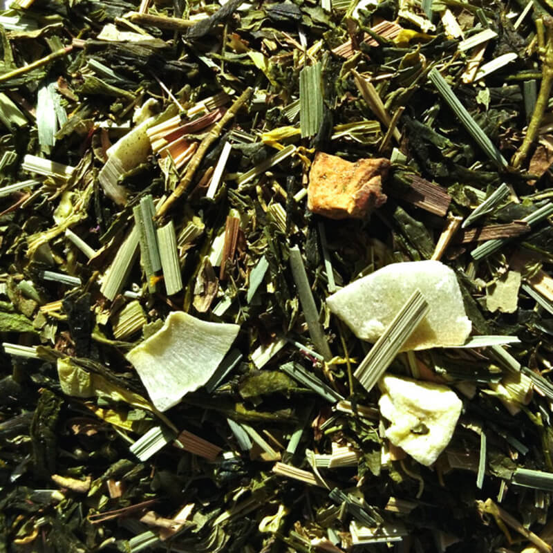 Grøn the med ananas, mango, marokkansk nanamynte, lemongrass, eukalyptus, æble, orangeskal og ristede kokosflager.