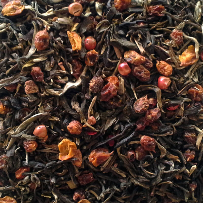 Hvid theblanding med havtorn, hindbær, kærlighedsfrugt og pink peberkorn.