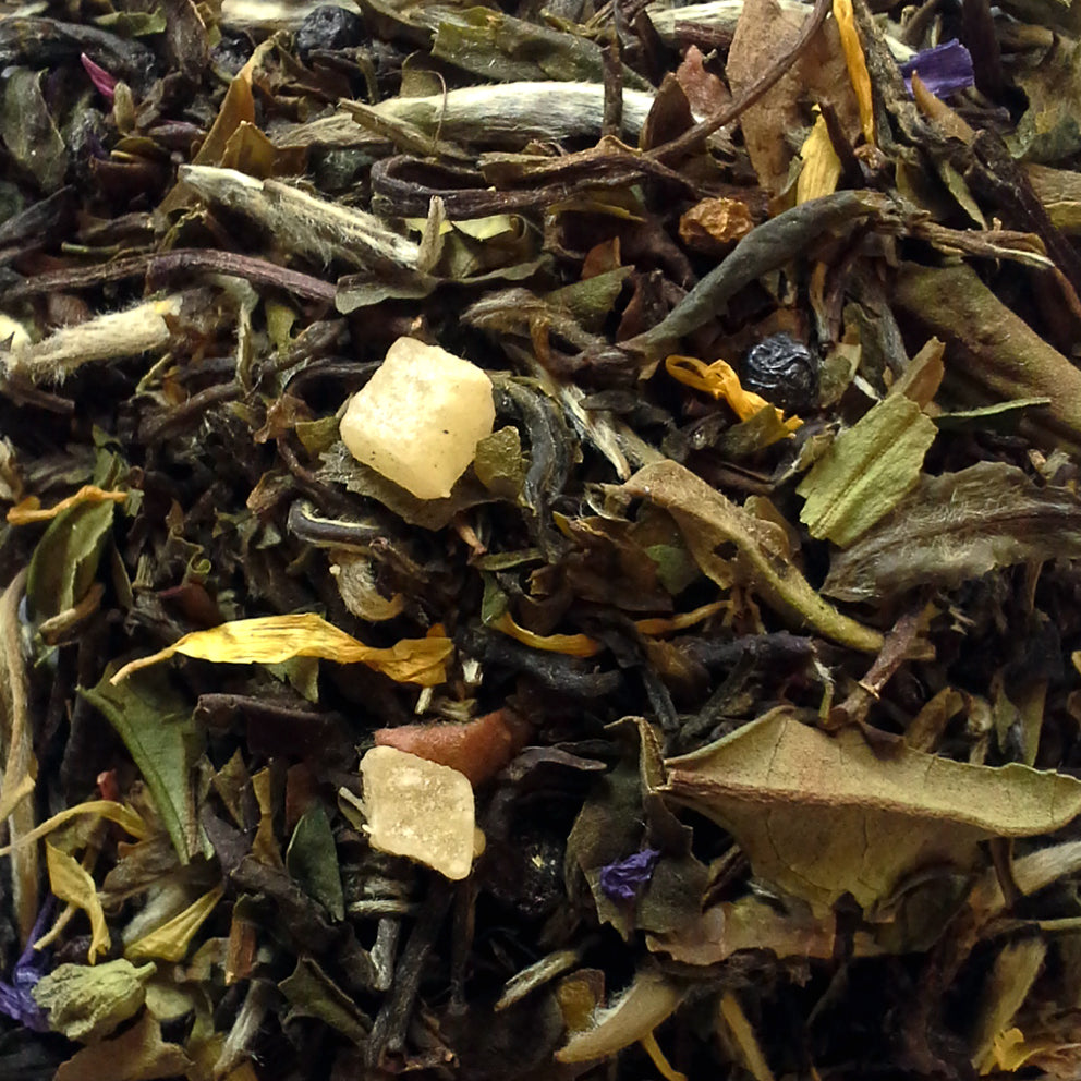 Udsøgt hvid the med ananas, solbær, hyldebær, jordbær, appelsinskal, fersken, jasminperler, aroniabær, hyldeblomst, katostblomster og lyserøde kornblomster.