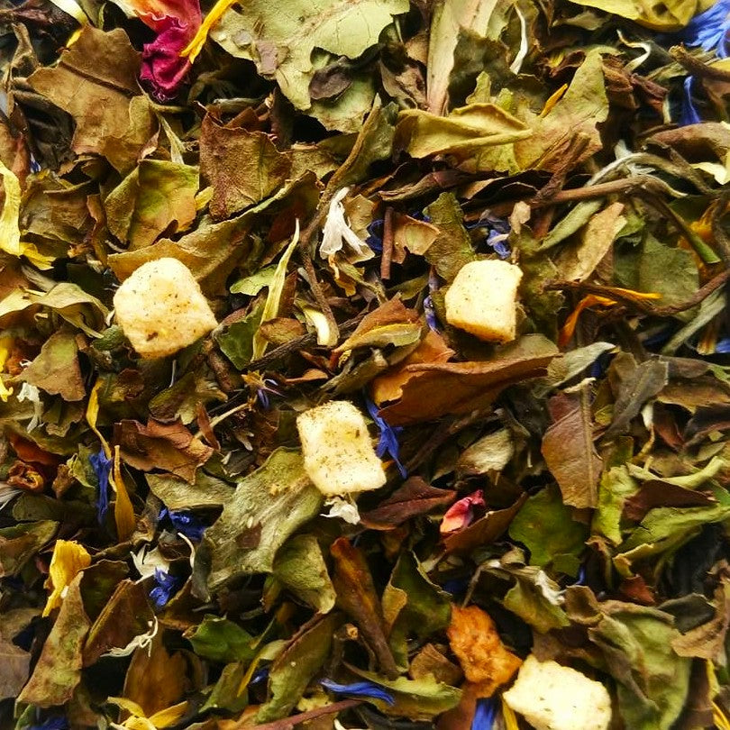 Hvid kinesisk the med ananas, kokos, pære, hyldebær, hyldeblomst, brombærblade, rosenknopper og vilde markblomster.