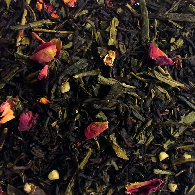Husets egen blend af grøn og sort kinesisk the med mandel og kirsebær.