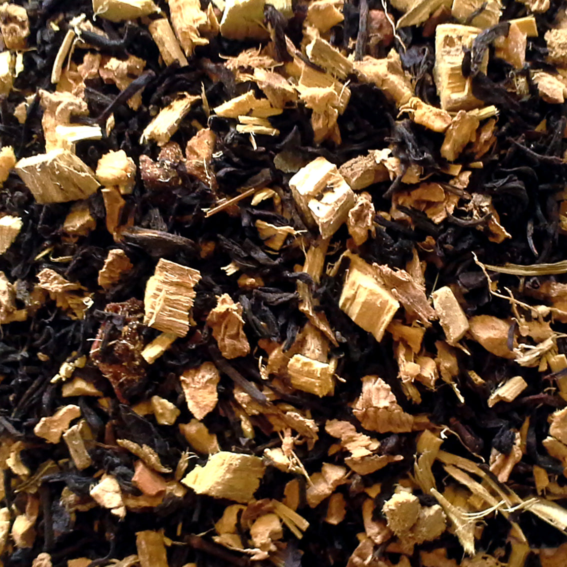 Sort kinesisk the med æblestykker, kanel, vilde jordbærblade, ingefær og lakridsrod.