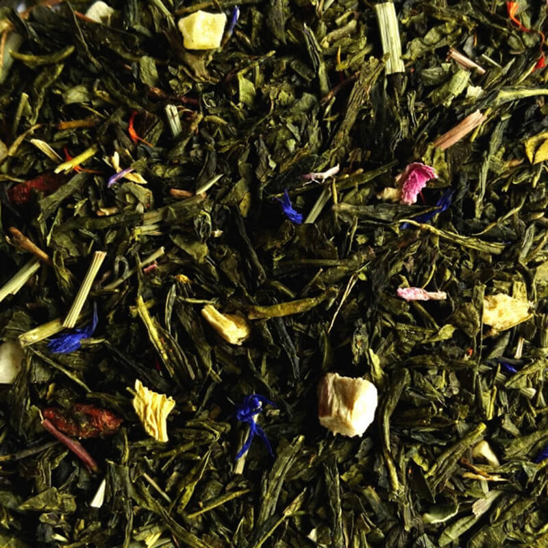 Husets blend af grøn kinesisk the med rabarber, gojibær, ananas, blåbær, granatæble, bergamotteolie og blomsterpynt.