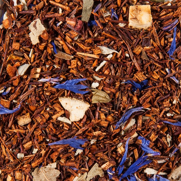 Afrikansk Rooibos med kokos, orangeskal, hindbær, brombærblade og kornblomst.