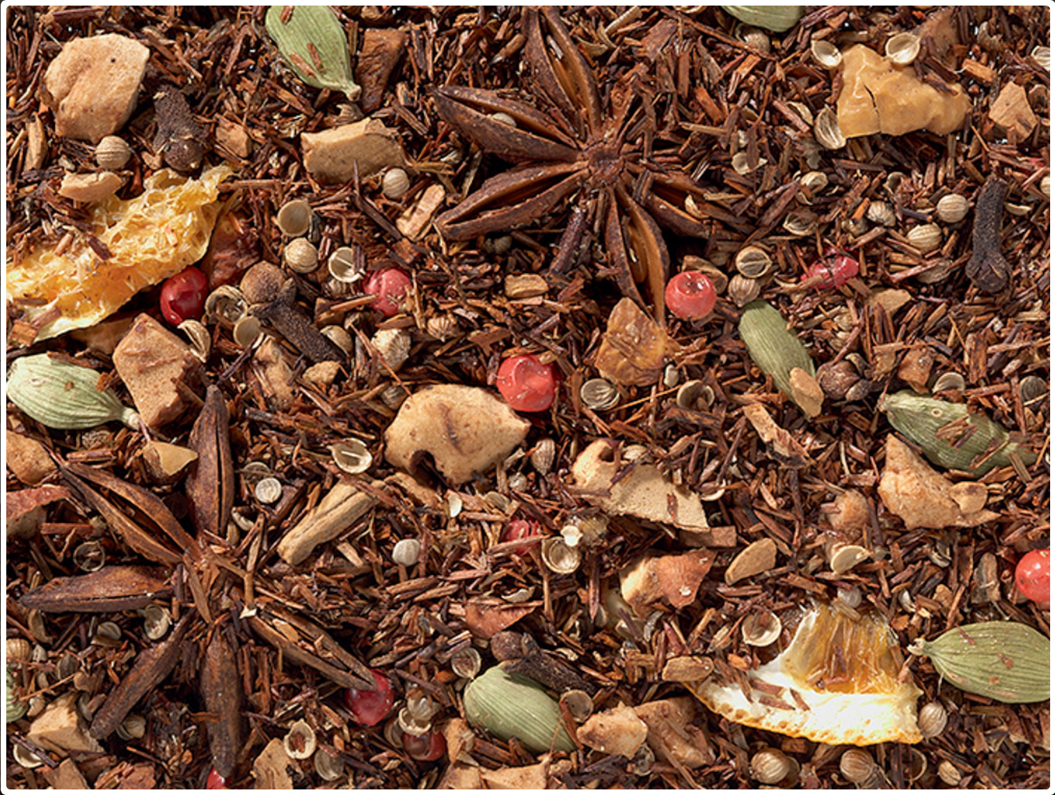Sydafrikansk rooibos med orange, æble, kanel, kardemomme, stjerneanis, kryddernellike og pink peberkorn.
