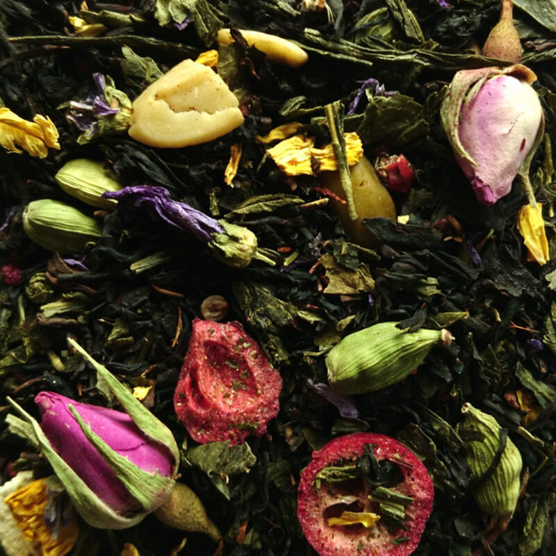 Husets blend af sort og grøn kinesisk the med rooibos, tranebær, orangeskal, koriander, pistacie, mandel, pink peberkorn, solsikkeblomst og morgenfrue.