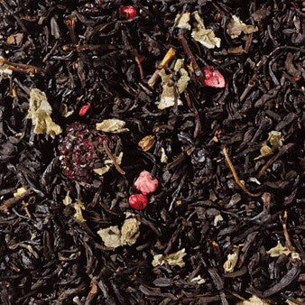 Sort aromatiseret the med hyldebær, solbær, hindbærstykker og hindbærblade.